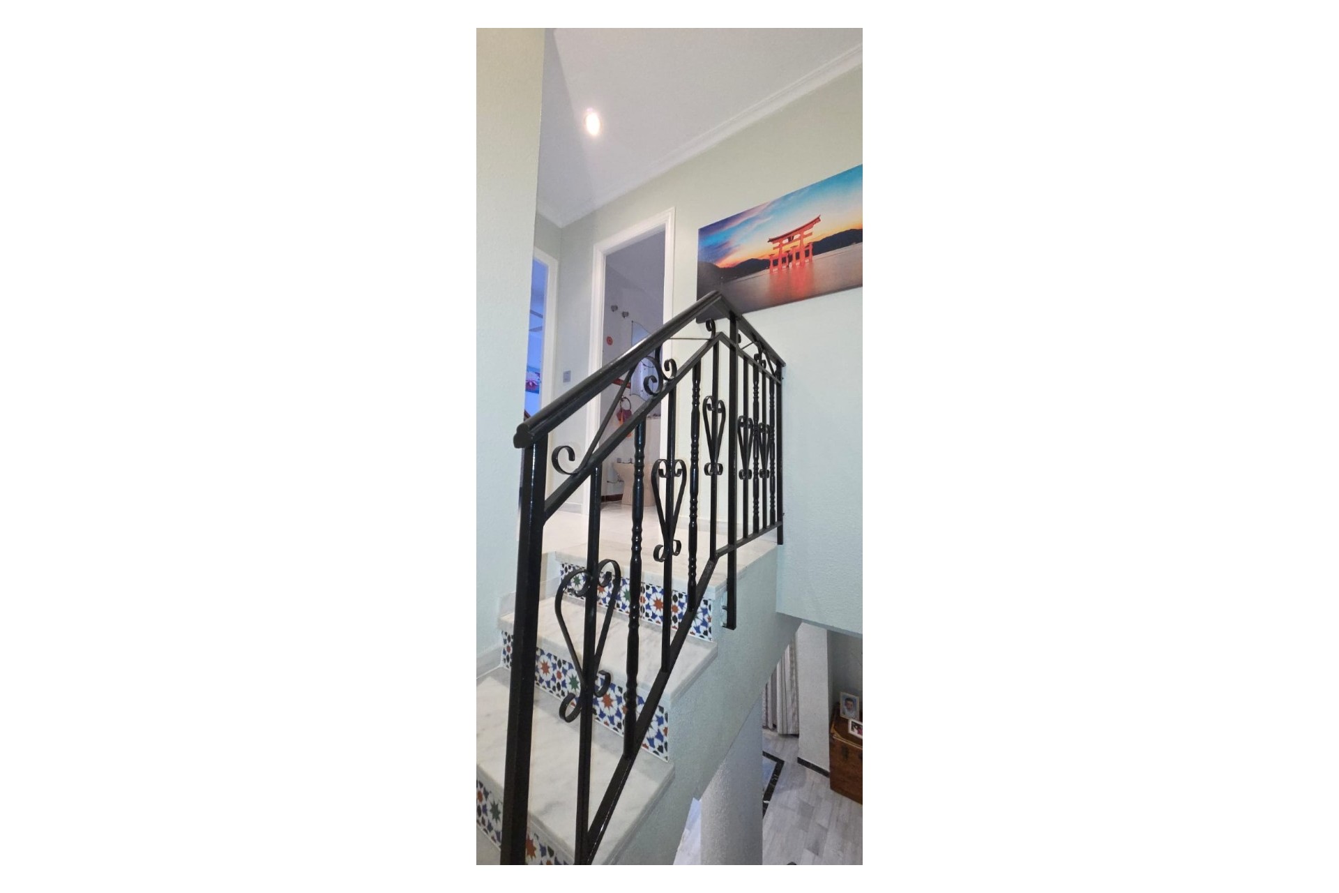 Parter składa się z salonu z jadalnią, łazienki, kuchni i patio. Na piętrze znajdują się dwie sypialnie, łazienka oraz mały taras z widokiem na morze.