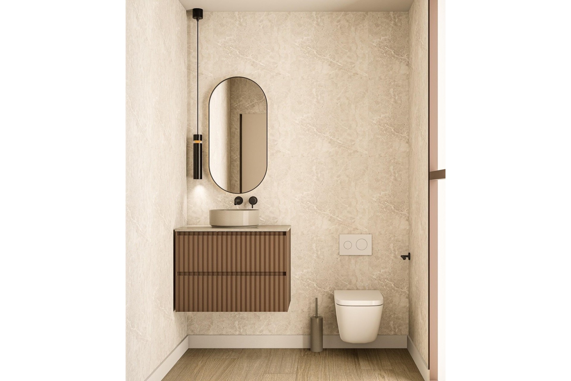 Дома также оснащены аэротермальными системами для нагрева воды, полностью оборудованными ванными комнатами с зеркалами и душевыми перегородками, а также имеют класс энергоэффективности A для максимальной эффективности.